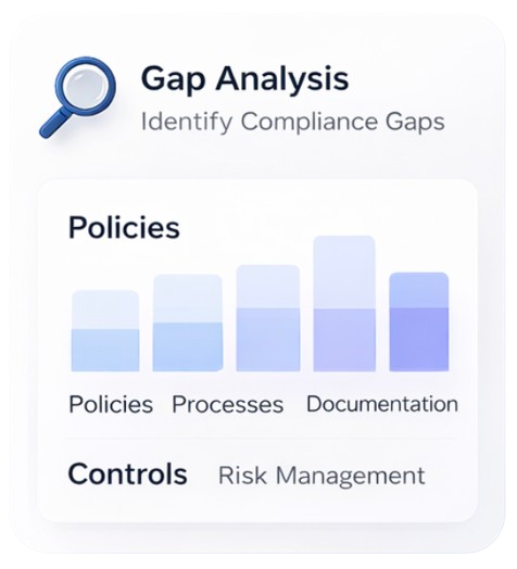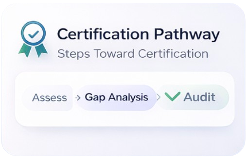 This comprehensive 360-degree evaluation reviews every aspect of your organization’s readiness, delivering deep insights, risk areas, and a complete roadmap to achieve confident certification.