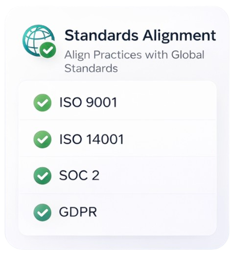 Our practical alignment service bridges the gap between your existing processes and international standards, ensuring seamless integration, compliance, and sustainable certification success.